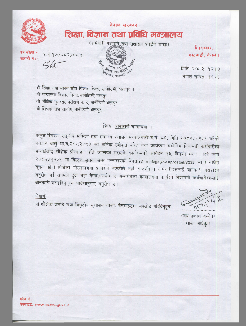शिक्षा, विज्ञान तथा प्रविधि मन्त्रालयअन्तर्गतको कर्मचारी प्रशासन तथा सुशासन प्रवर्द्धन शाखा ले जारी गरेको सूचनाअनुसार संघीय मामिला तथा सामान्य प्रशासन मन्त्रालय को पत्रका आधारमा २०८२ चैत १ गतेदेखि १५ दिनको म्याद दिई आवेदन आह्वान गरिएको छ। मन्त्रालयका अनुसार विस्तृत सूचना आधिकारिक वेबसाइटमा प्रकाशित गरिएको छ भने सोही मितिमा गोरखापत्र दैनिक मार्फत संक्षिप्त जानकारीसमेत सार्वजनिक भइसकेको छ।